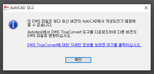 [이 DWG 파일은 보다 최신 버전의 AutoCAD에서 작성되었기 때문에 열 수 없습니다.]