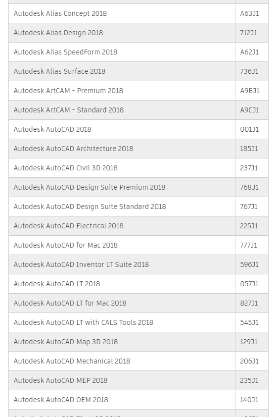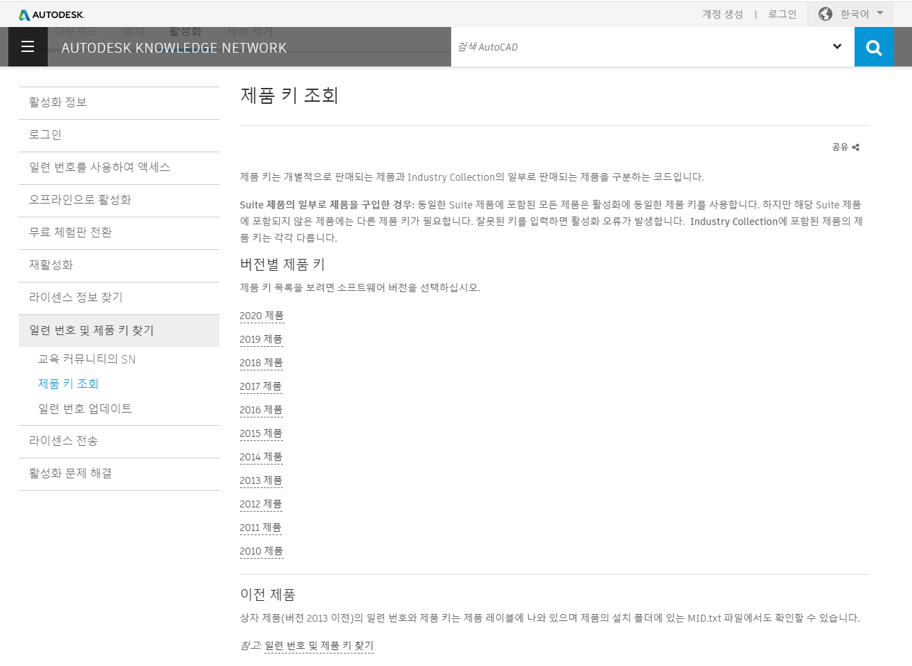 Autodesk 2010 제품군에서부터 Autodesk 2020 버전까지 년도별로 제품 키를 확인할 수 있습니다.