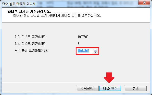 하나의 디스크당 1개의 볼륨을 주고싶으시다면 최대디스크 공간만큼 주시면 됩니다.