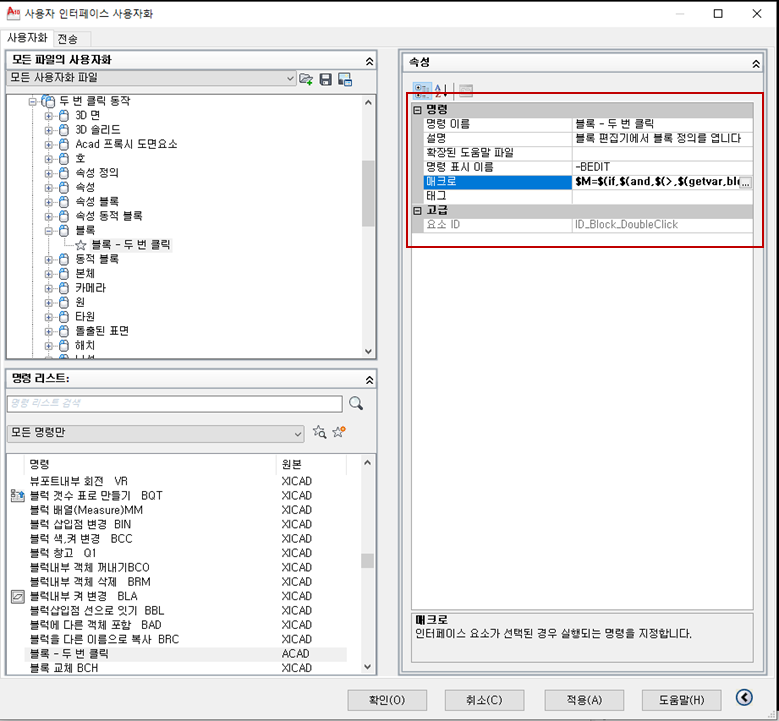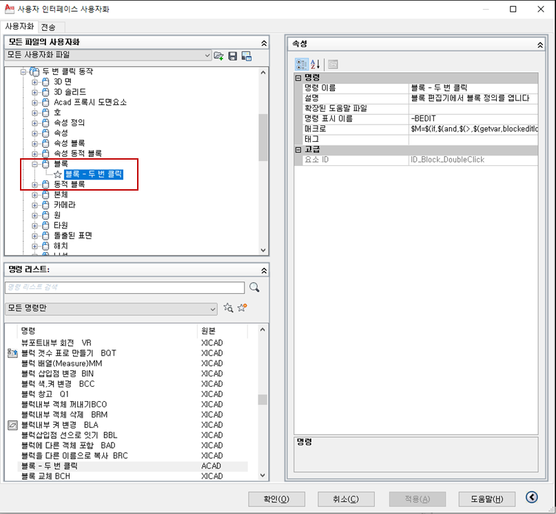 확장하면 여러항목중 블럭에 대한 더블클릭에 대해서 수정하는 것이므로, [블록]을 확장시켜줍니다