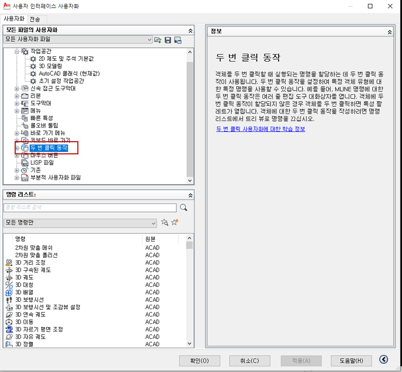 매크로 변경하는 방법은 사용자 인터페이스 사용자화(명령어 CUI)를 실행하신 후