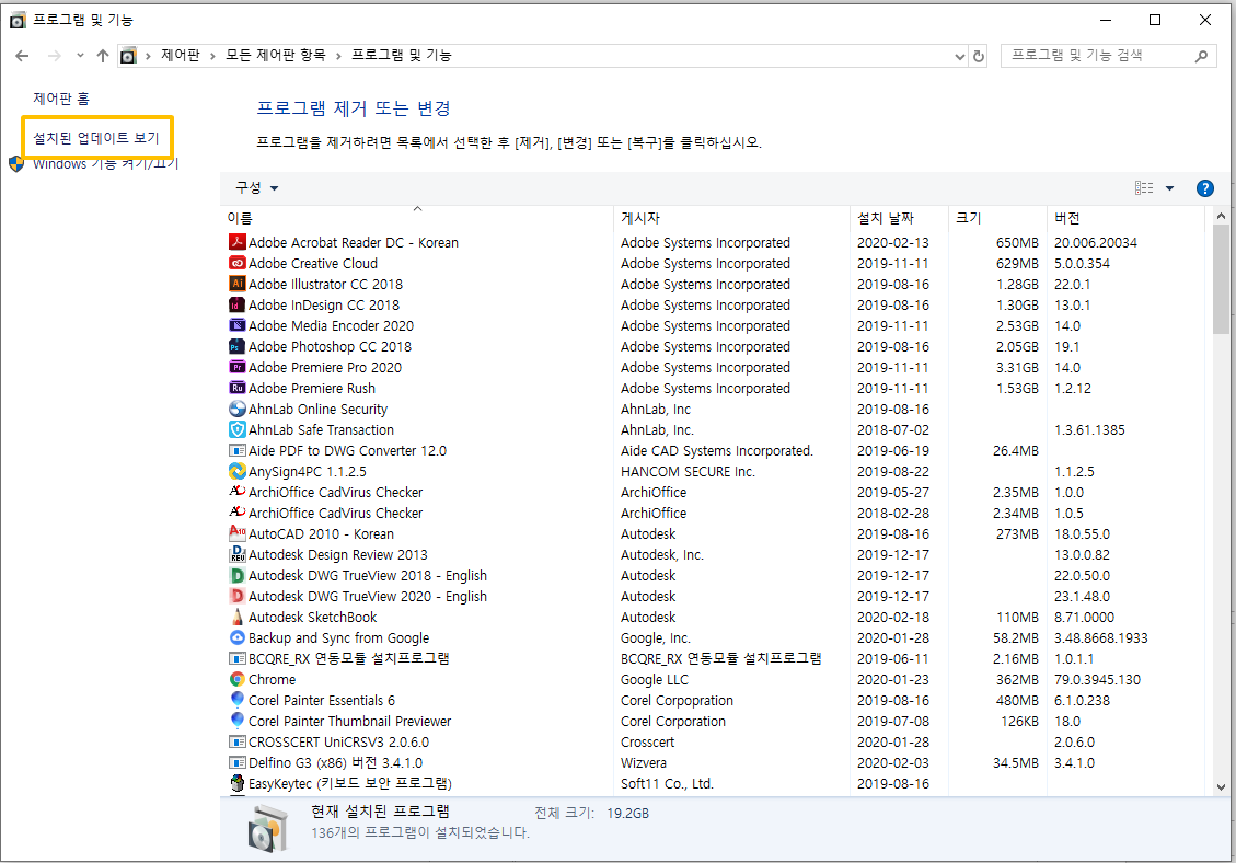 왼쪽에 [설치된 업데이트 보기]에 들어가주세요.