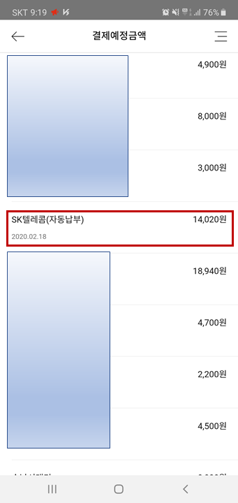 SK텔레콤으로 자동납부 금액이 14,020원입니다.