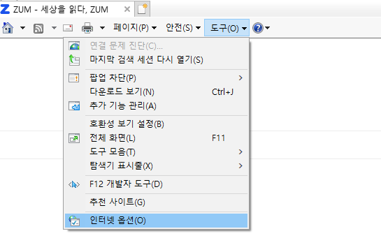2. 관리자 권한 실행 후에 [도구]- 인터넷 옵션으로 들어가 줍니다.