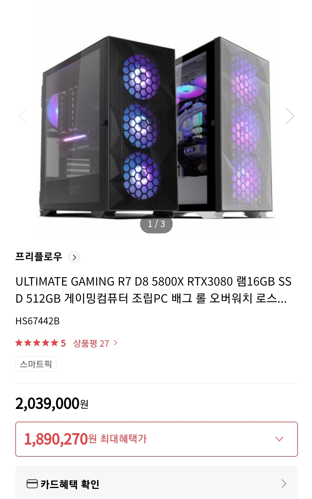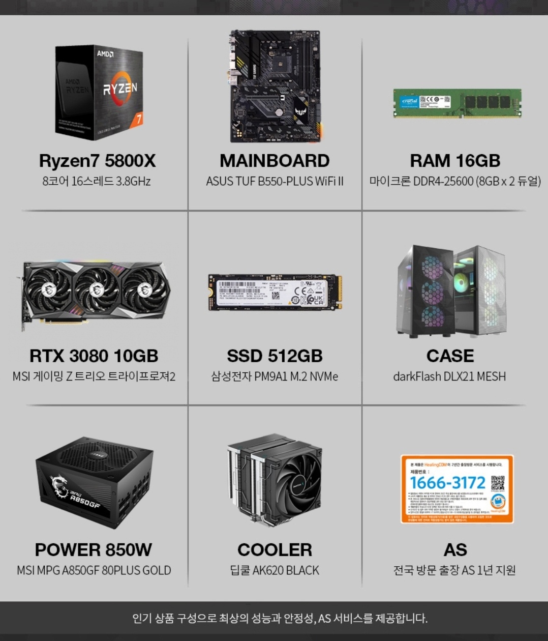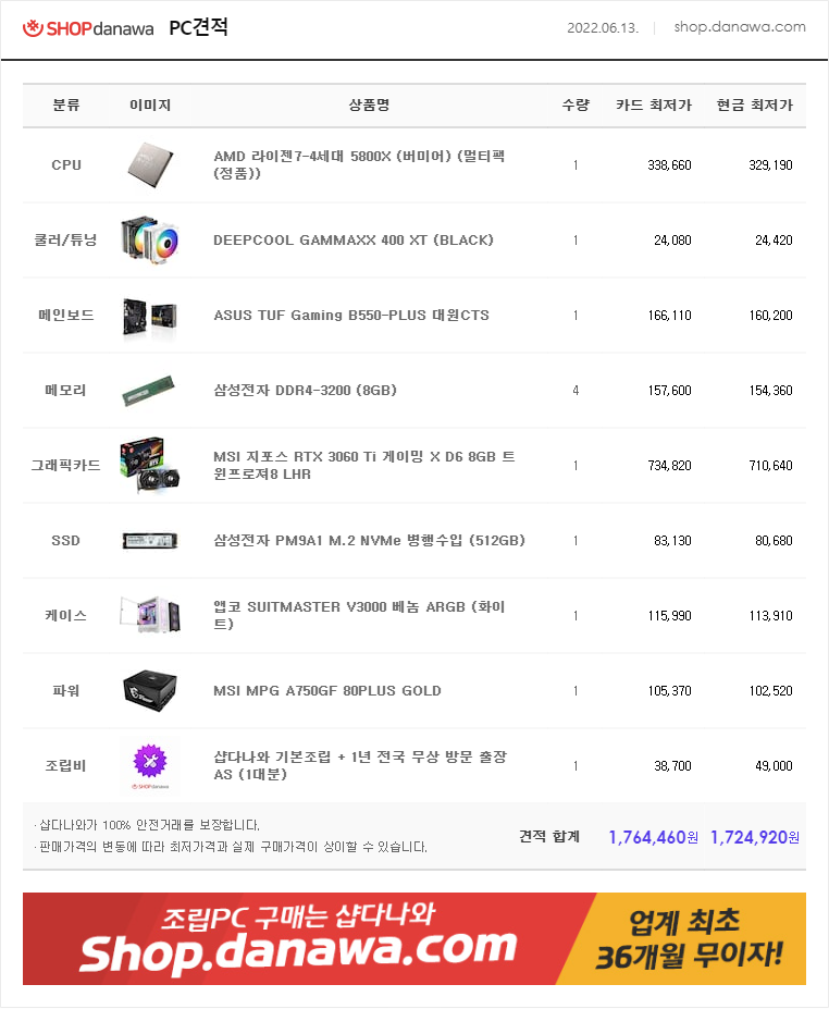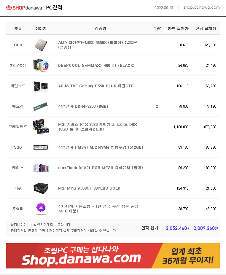 최초견적이랑 비교하면 12만원(램업글시 +7만원)만 더주고 3060ti에서 3080으로 업그레이드 한것이지 않은가?