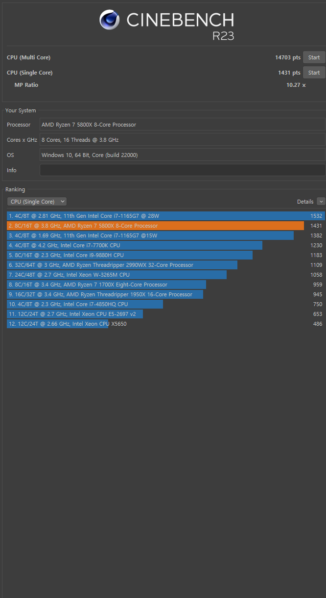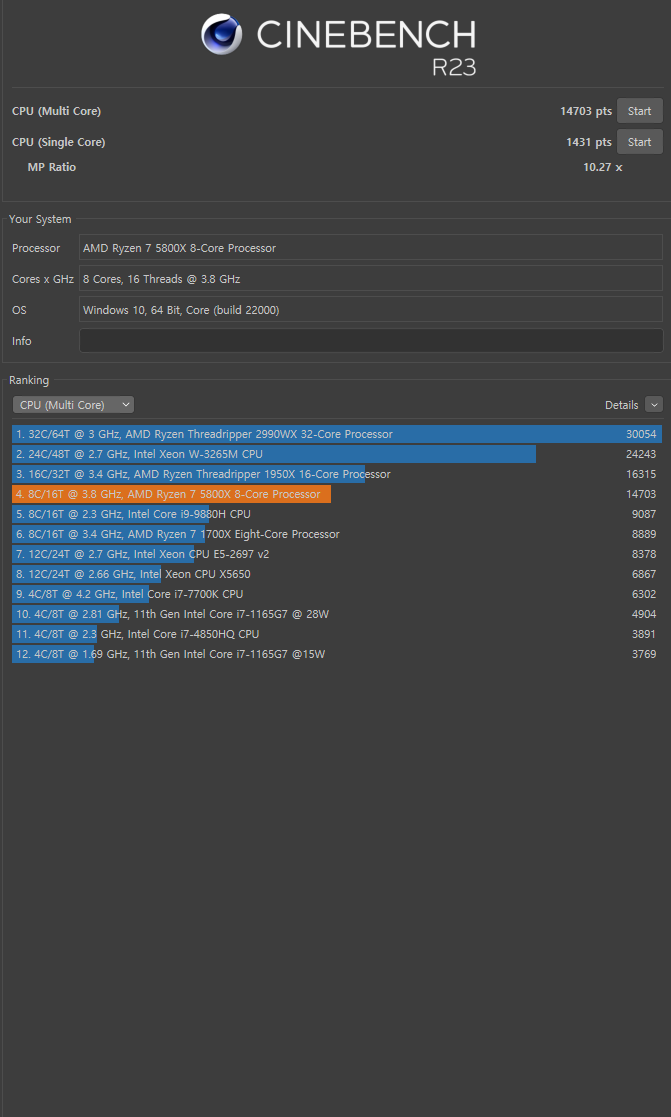 오버없이 세팅하고 돌린 시네벤치 R23 점수임에도 꽤나 준수한 점수를 보여주고 있어서,