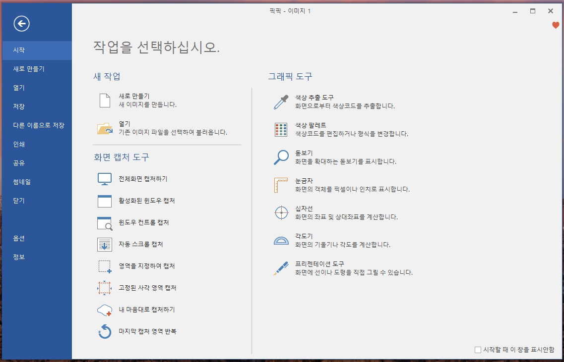 픽픽은 화면 캡처뿐만 아니라 색상추출, 돋보기, 각도기등 여러기능을 사용할 수 있는 유틸성이 높은 프로그램입니다.